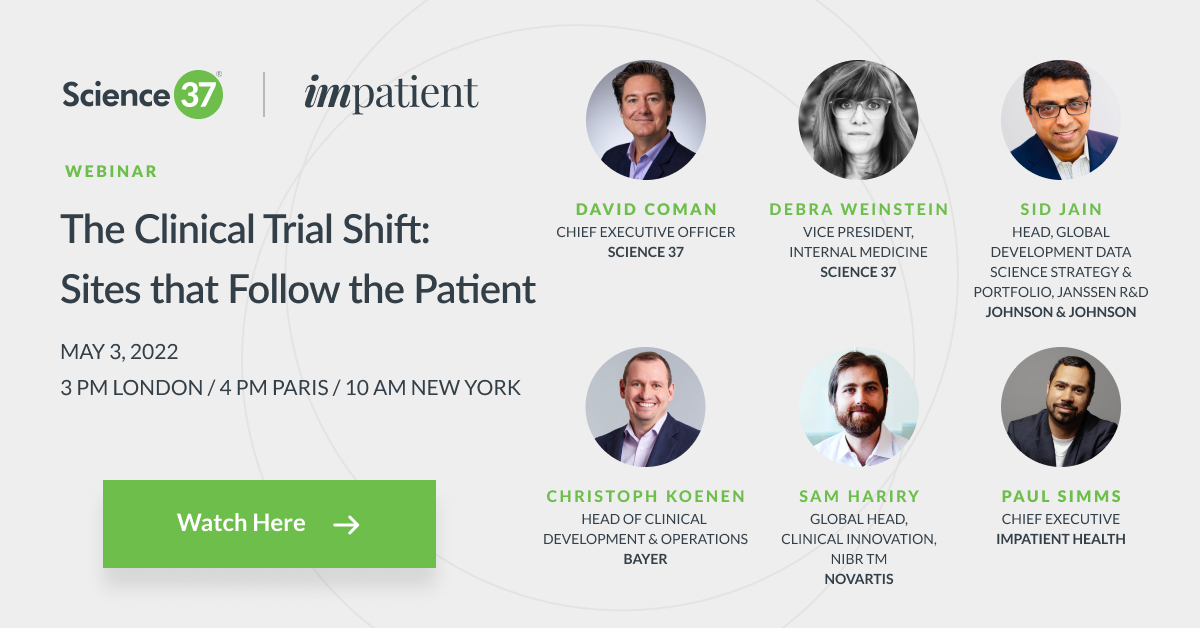 In this video-on-demand, find out why a patient-centered approach requires both a shift—a mind shift—and a pragmatic, coordinated approach to seeing it through. Science 37 CEO, David Coman, and VP of Internal Medicine, Dr. Debra Weinstein, join a group of leaders from Janssen, Bayer, and Novartis, to discuss what the ideal patient model really is—and how to deliver this patient-first approach.